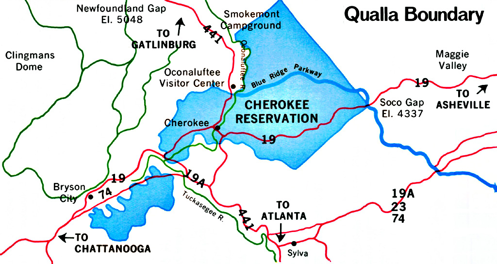 Die Oconaluftee Region verläuft allmählich breiter werdend dem Oconaluftee Flußbecken entlang von Smokemont im Norden zur Qualla Grenze als seine Südspitze. Die Qualla Grenze, oft auch "Cherokee, North Carolina" genannt, umfasst den Großteil einer Bundestreuhandschaft, die als Reservat für die "Eastern Band of the Cherokee" dient.