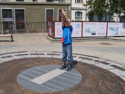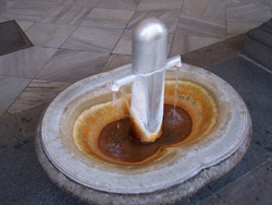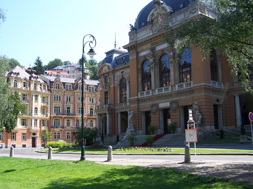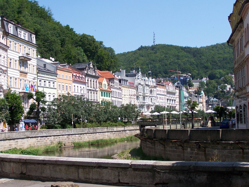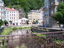 Durch das enge Tal wandernd, das die Teplá über die Zeit abtrug, säumen sich zahlreiche Hotels und Cafés. So kommen wir an einen großen, offenen Platz, an dem wir die Sprudelkolonnade vorfinden. In dem Gebäude mit den meisten Quellen befindet sich auch die höchstspritzende Quelle, der 'Fridolin' Sprudel. Dahinter ist auf dem Boden eine Sonnenuhr. Gegenüber der höherliegenden Straße ragt die Marien-Magdalenenkirche. empor.