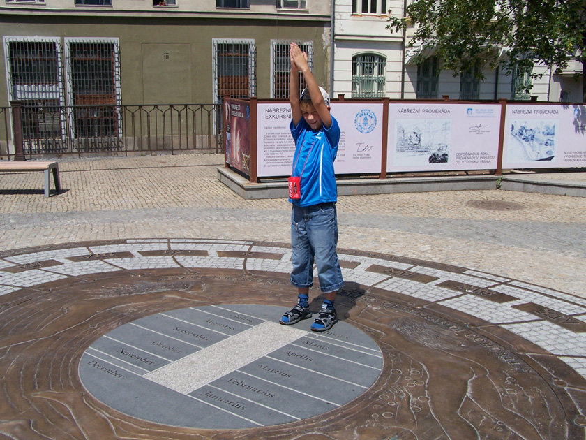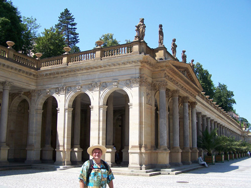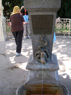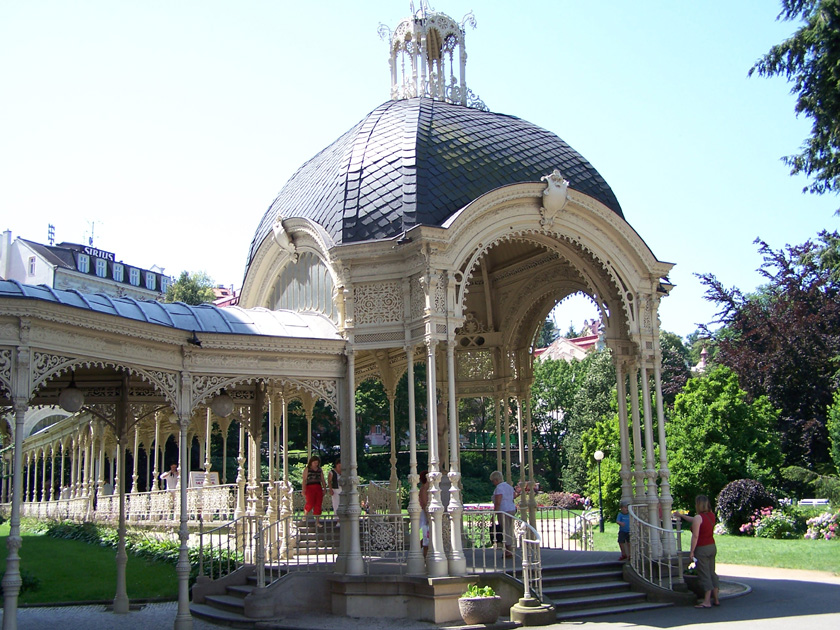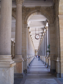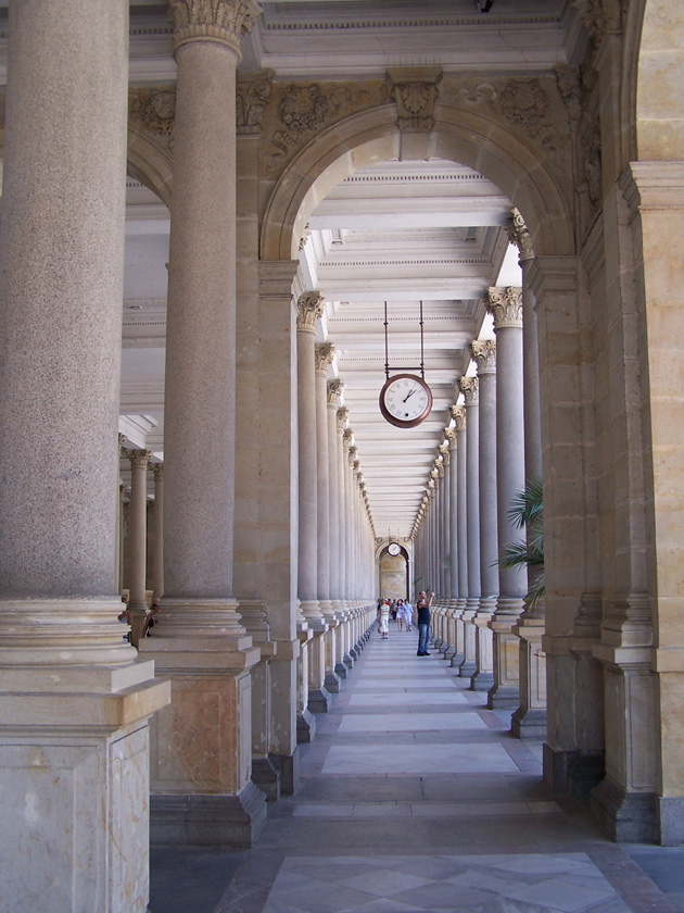 Entlang der Teplá folgend stoßen Sebastian und ich auf die Mühlenkolonnade, in der sich die Quelle 'Kníže Václav I' mit einer Temperatur von 65°C befindet. Schlendernd durch den bekannten Säulengang mit der Uhr, bei der Hitze im Schatten, erreichen wir später die Gartenkolonnade. Am Ende des Gangs liegt die Schlangenquelle.