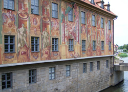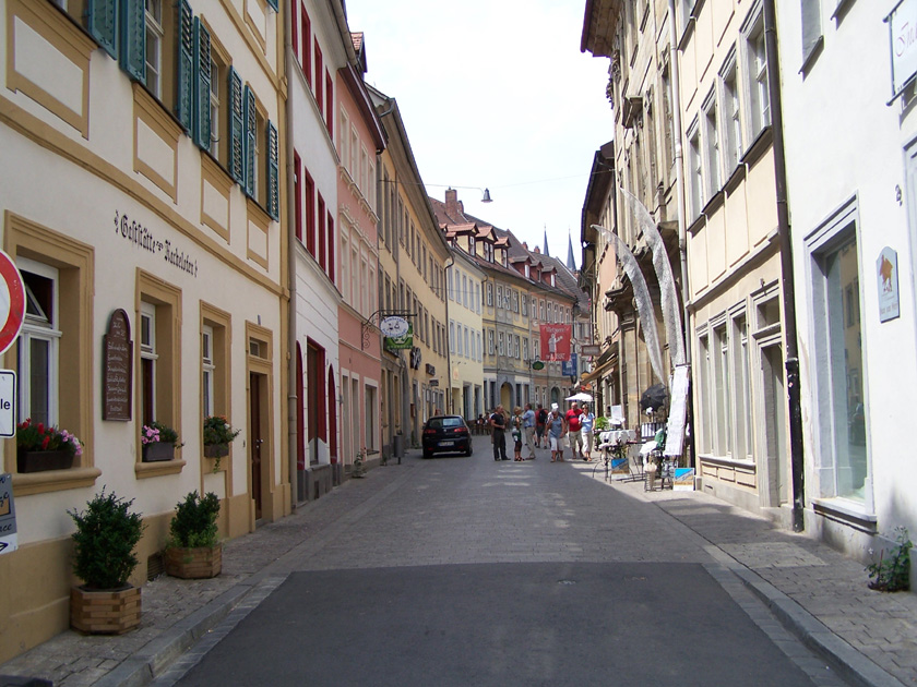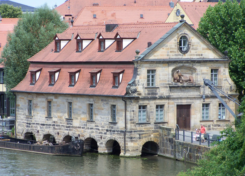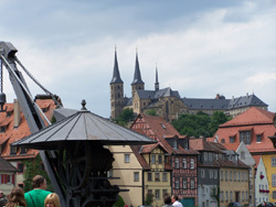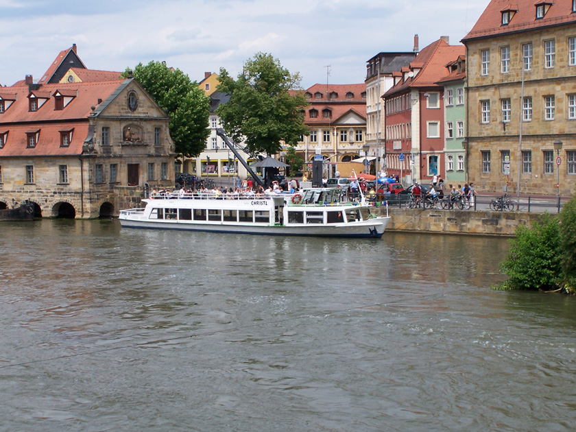 An den Flussarmen der Regnitz findet man 'Kleinvenedig' und im Anschluß Richtung 'Altes Rathaus' den Stadtplatz 'Am Kranen', der auch als Anlegestelle für eine Schiffstour dient. Von dort aus kann man auch den Michelsberg mit seinem Kloster sehen.