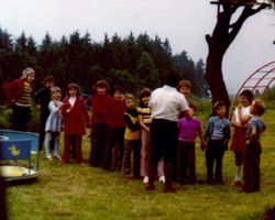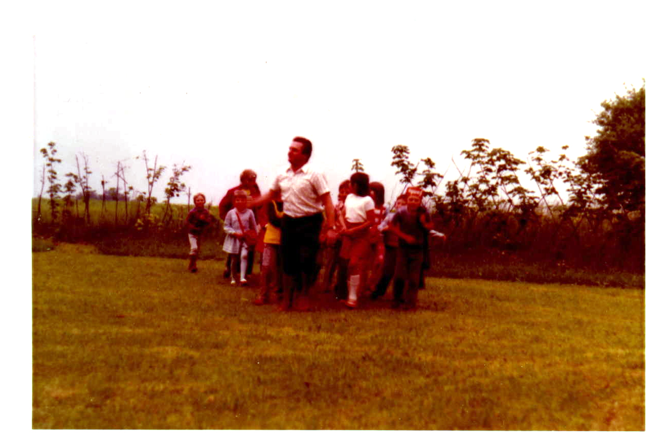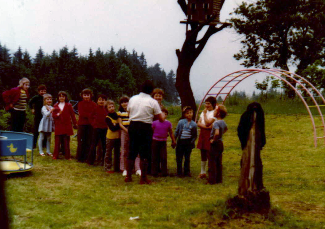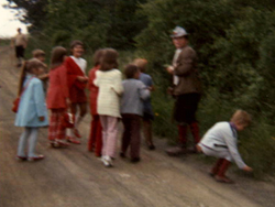 Übers Ludwigsland führt Konrad Schütz als der lustige Lehrer eine Traube Kinder zum "Häusla" auf der Redwitzer Höhe.